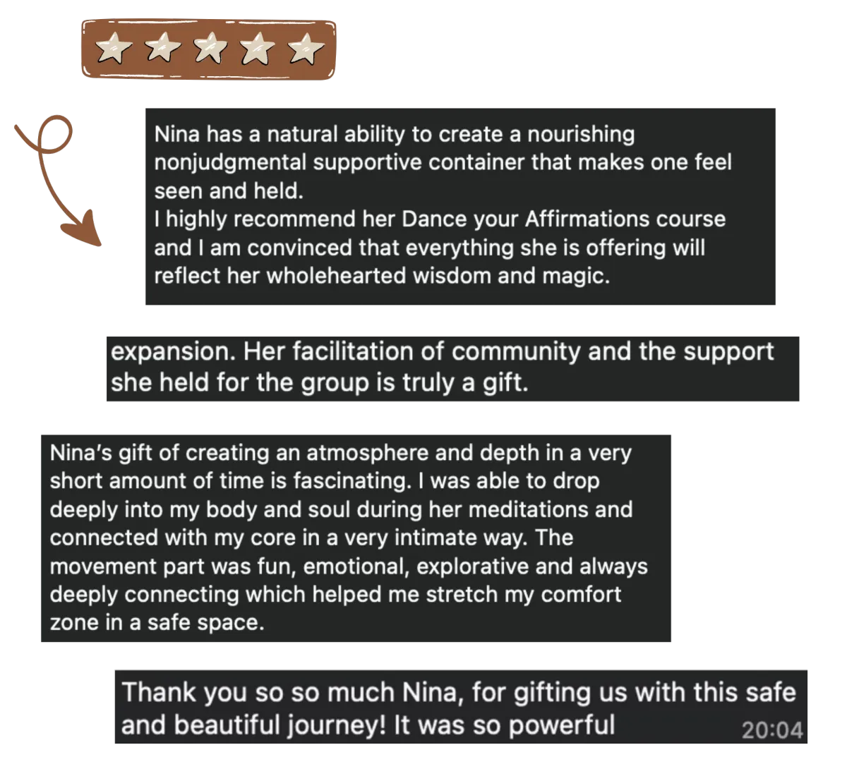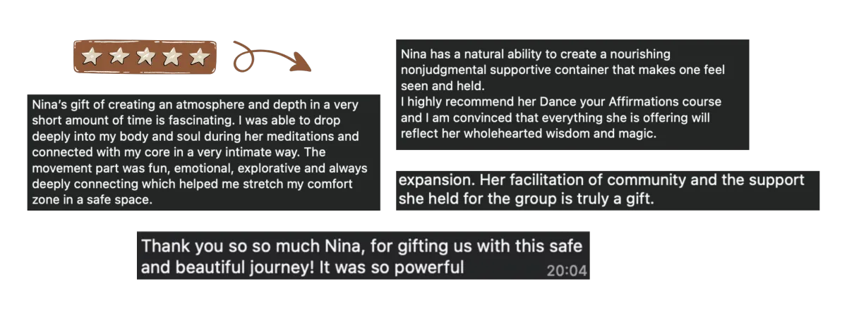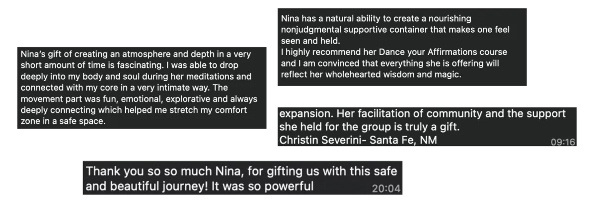 Nina’s Dance Your Affirmations was a beautiful daily journey for me of self love, rooting, and reclamation.